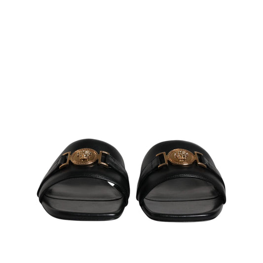Versace Black Leather Logo Plaque Slip On Slides Flats Shoes